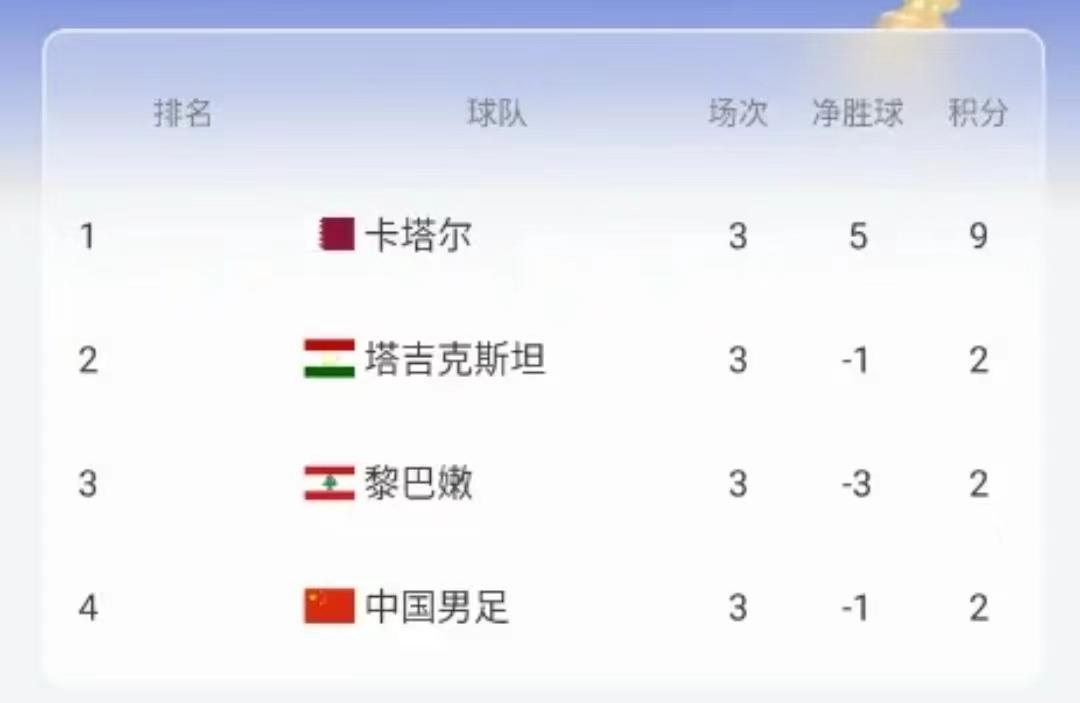 與此同時,另一片場地黎巴嫩取得進球,按照這樣的比分,國足就要出局了,隨後,頑強的塔吉克斯坦又扳平了比分,兩隊戰成1比1,而此時的及時排名,3隊同積2分,但國足更慘,因爲進球數劣勢,已經跌落到小組墊底了!