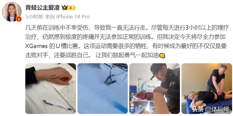 “幾天前在訓練中不幸受傷,導致我一直無法行走。儘管每天進行3小時以上的理療治療,仍然感到極度的疼痛並無法參加正常的訓練。“但我決定今天將盡全力參加XGames 的U槽比賽。這項運動需要很多的犧牲,有時候成爲最好的不僅僅是要擊敗對手,還要戰勝自己。讓我們鼓起勇氣一起加油。”