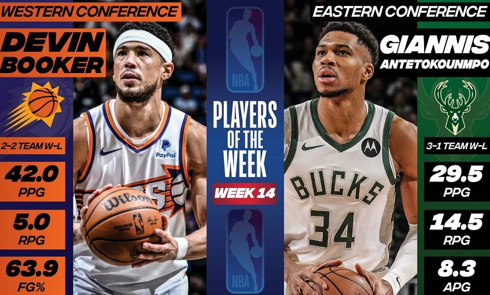 NBA官方公佈了上週東西部周最佳球員,東部由雄鹿前鋒字母哥當選,西部由太陽後衛布克當選。字母哥上週場均砍下29.5分+14.5籃板+8.3助攻+1.5搶斷+1.3蓋帽,投籃命中率高達60.3%,三分球命中率達到42.9%,帶領雄鹿取得3勝1負的戰績。據統計,這是字母哥本賽季第二次當選周最佳,也是生涯第23次當選周最佳。布克上週場均豪取42分+5籃板+3.8助攻+1.3搶斷+1蓋帽,投籃命中率爲63.9%,三分球命中率爲50%,帶領太陽取得2勝2負的戰績。據統計,這是布克本賽季第2次獲此殊榮,也是生涯第9次獲此殊榮。值得一提的是,東契奇、亞歷山大、小卡、拉塞爾、恩比德、米切爾、莊神、西亞卡姆等球星獲得了周最佳提名。