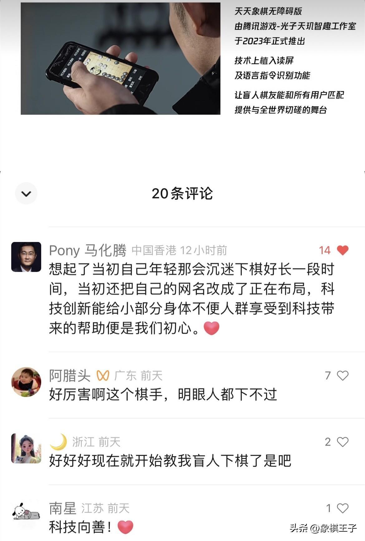 在閱罷片子後,騰訊CEO馬化騰感觸極深“想起了當初自己年輕那會沉迷下棋好長一段時間,當初還把自己的網名改成了正在佈局,科技創新能給小部分身體不便人羣享受到科技帶來的幫助便是我們初心”。