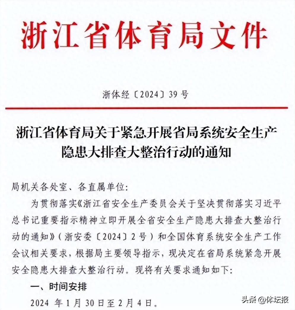 1月30日,省體育局發出通知,強調全省各級體育部門要將思想和行動統一到習近平總書記重要指示批示精神上,認真落實黨中央、國務院決策部署,按照國家體育總局和省委、省政府關於做好安全生產和消防工作部署要求,牢固樹立“生命至上、安全第一”理念,嚴格按照“安全生產隱患排查不到位是失職,排查出來的風險隱患不整改是瀆職”的要求,進一步推動責任壓實、舉措落實、工作做實,春節前全方位、地毯式、無死角開展體育領域集中安全生產風險隱患排查整治工作,確保人民羣衆生命財產安全,更好統籌體育高質量發展。