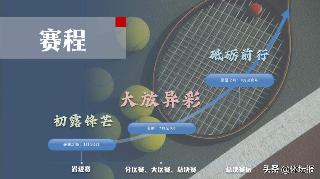 同時,首批參與賽事的省市名單和部分分區賽、大區賽承辦城市名單已出爐:其中,天津、貴陽、京山、東陽四地將承辦分區賽;日照、福州將承辦大區賽(全國總決賽承辦城市仍在評估之中,有意承辦單位還可向中國網球協會提出申請)。