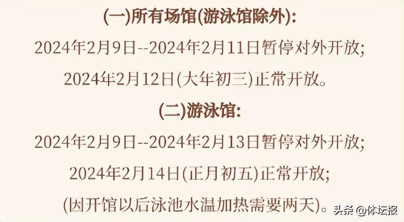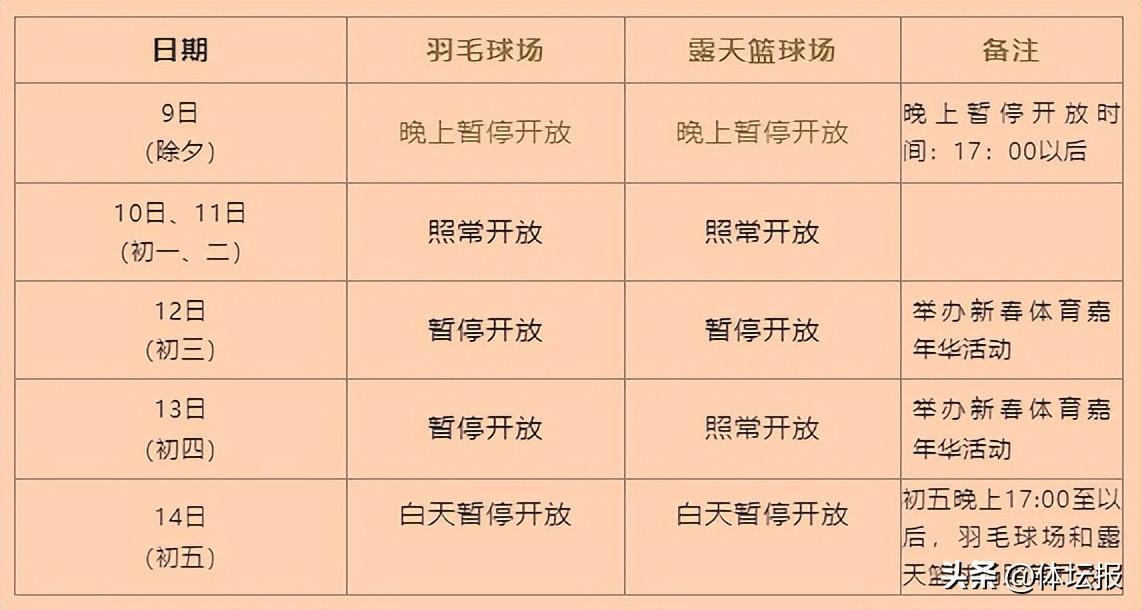 4.其他場館:2月9日上午正常開放,12:00-21:00期間閉館;2月10日-17日期間白天免費對外開放,晚上正常開放。鍛鍊市民可通過線上預約搶票,羽毛球館接受當天預約,其他場館可提前一天預約。