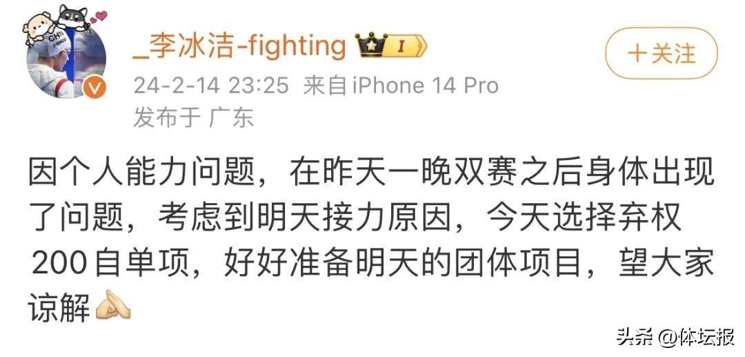 而此前奪得兩枚銀牌的李冰潔賽前宣佈棄賽。“因個人能力問題,在昨天一晚雙賽之後身體出現了問題,考慮到明天接力原因,今天選擇棄權200自單項,好好準備明天的團體項目,望大家諒解。”李冰潔在個人社交媒體上寫道。