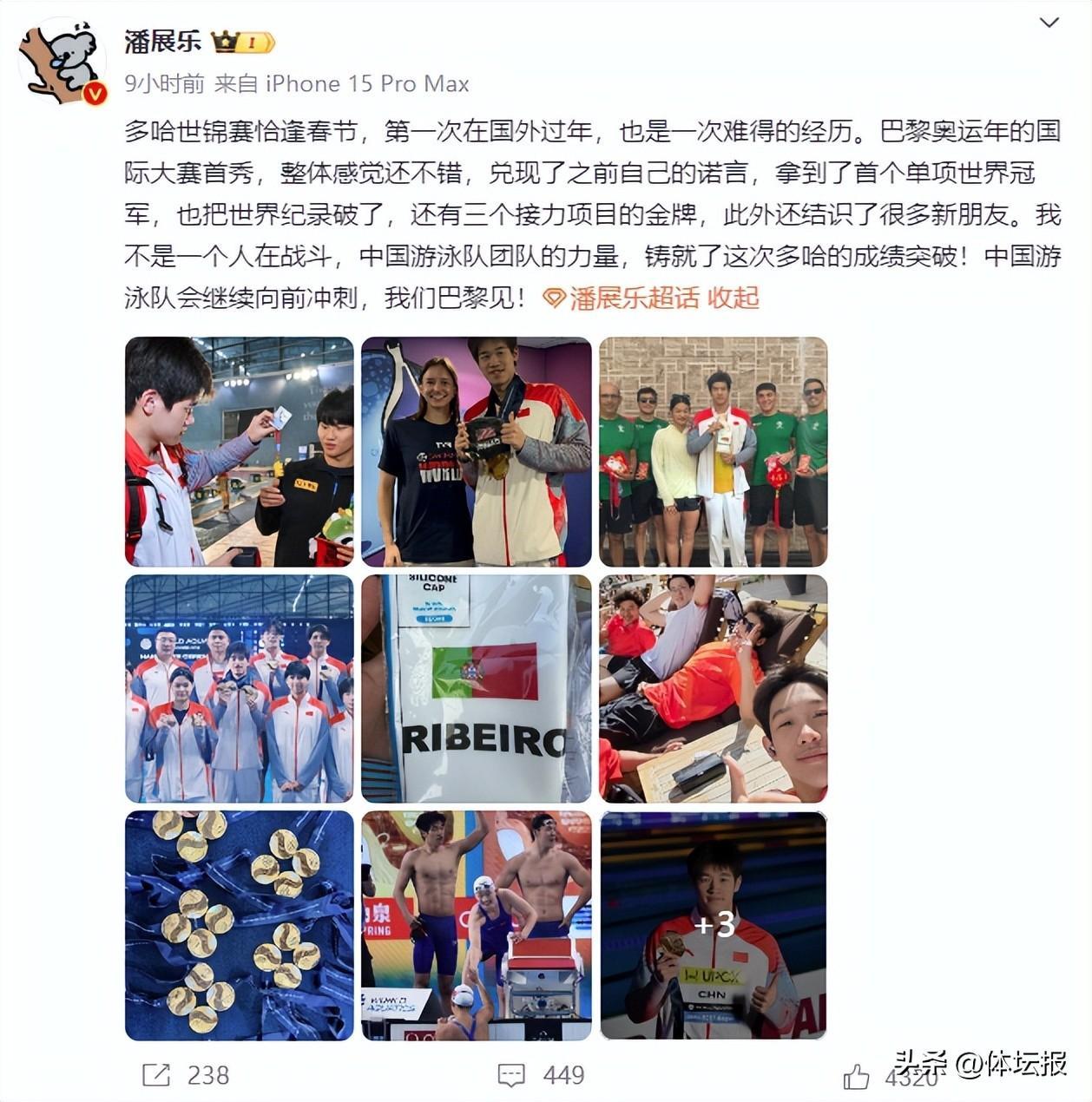 “下班”之後潘展樂在社交平臺分享了自己的多哈小結,“我不是一個人在戰鬥,中國游泳隊團隊的力量,鑄就了這次多哈的成績突破!中國游泳隊會繼續向前衝刺,我們巴黎見!”