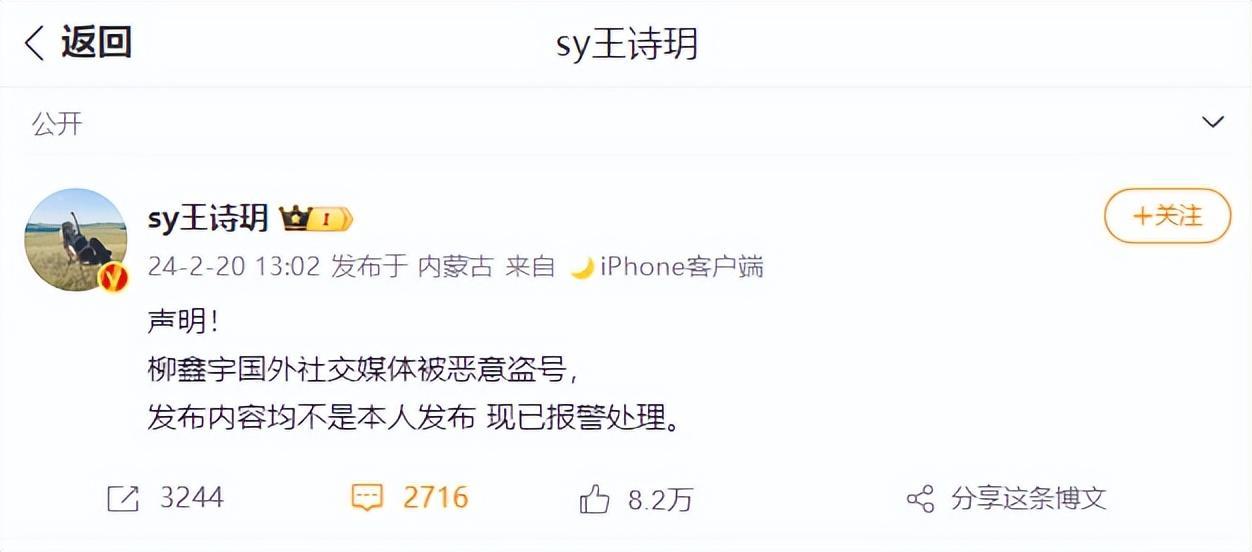 柳鑫宇用王詩玥賬號發聲:非常憤怒!爆料內容不實,本人已報警