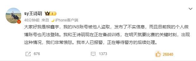 隨後,柳鑫宇終於發聲,不過還是用的搭檔的賬號,他表示,自己和王詩玥現在正在備戰訓練,出現這種情況,非常憤怒,本人已報警,正在等待警方的後續處理。