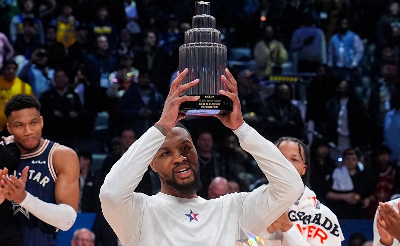 在前天舉行的三分球大賽中,利拉德在決賽擊敗了卡爾-安東尼·唐斯和特雷·楊,奪得冠軍。然後昨天他投進了11記三分球,拿下了全隊最高的39分,力壓東道主哈利伯頓拿到了12張選票中的7張,當選爲全明星MVP,捧走了科比·布萊恩特杯。整個全明星週末,他是最大的贏家。上次有人同時拿到全明星MVP和單項賽冠軍還要追溯到1988年,邁克爾·喬丹同時贏得了全明星MVP和灌籃大賽的冠軍。