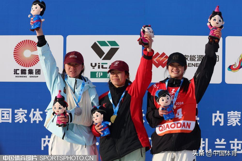 中國體育訊 2月26日,第十四屆全國冬季運動會自由式滑雪女子U型場地技巧公開組決賽,在內蒙古扎蘭屯金龍山滑雪場舉行。黑龍江隊張可欣以90.50分獲得金牌,山東隊李方慧和河北隊李沁源分獲銀牌和銅牌。(中國體育圖片 安靈均 攝)