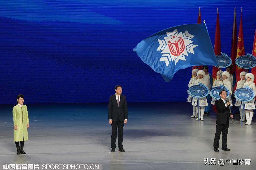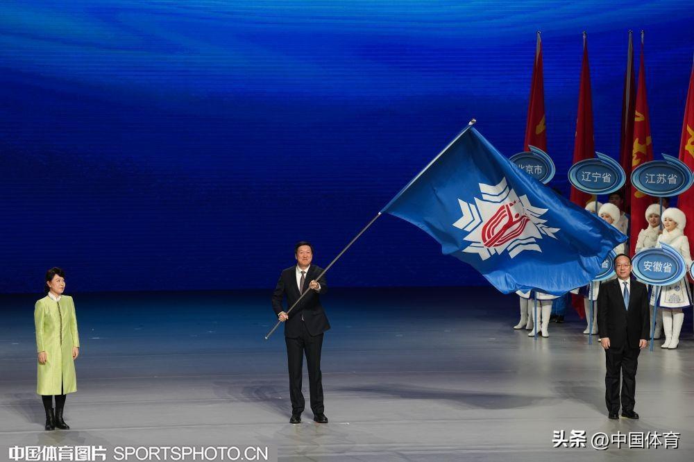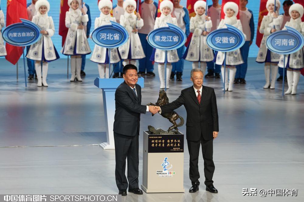 第十四屆全國冬季運動會組委會主任、國家體育總局局長高志丹(中)在閉幕式上交接會旗