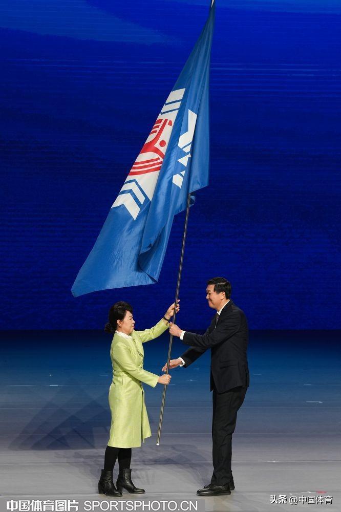 第十四屆全國冬季運動會組委會執行主任、內蒙古自治區主席王莉霞(左)在閉幕式上交接會旗