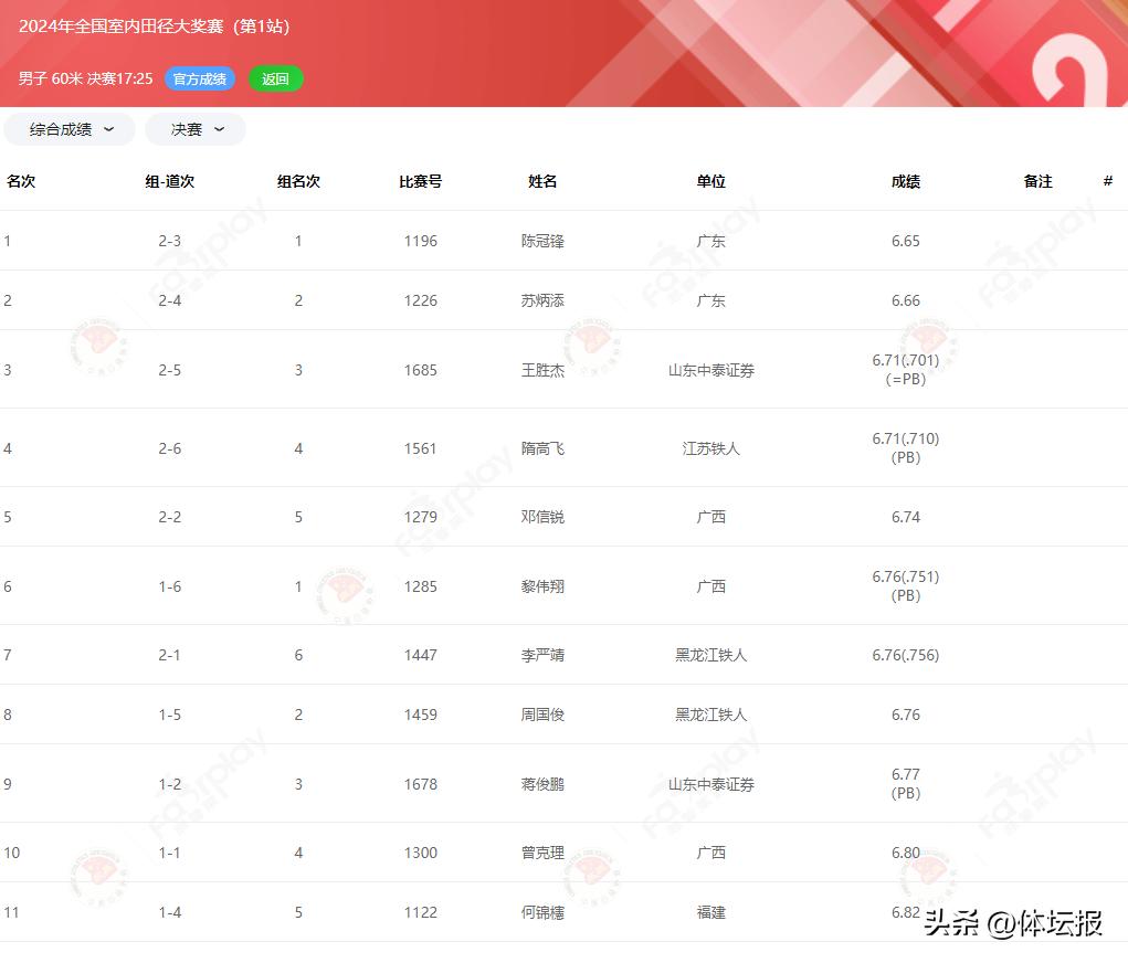 同日傍晚,“中國飛人”蘇炳添在男子60米決賽中跑出6秒66獲得亞軍,冠軍被他的廣東隊隊友陳冠鋒以6秒65奪得。