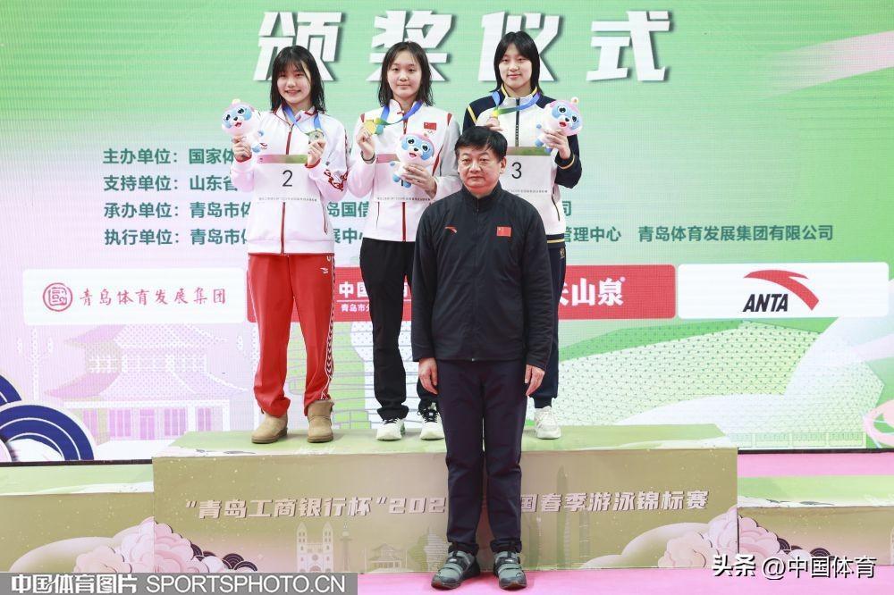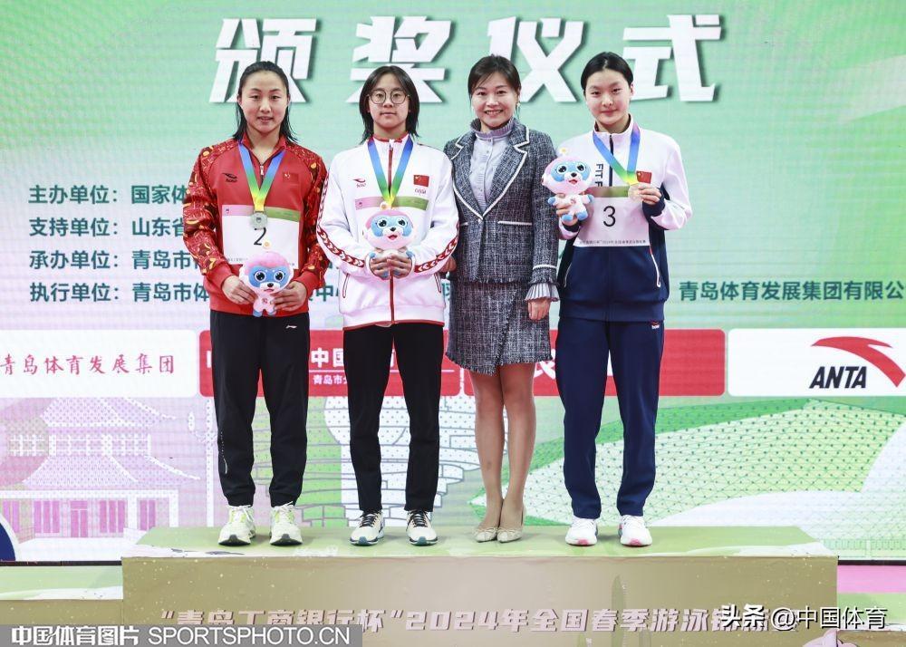 (左起)亞軍孔雅琪、冠軍李欽悅、季軍尹嘉禾在女子400米自由泳頒獎儀式上