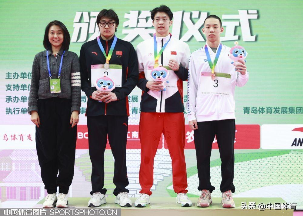 (左起)亞軍張中信、冠軍崔恩哲、季軍梁家玥在男子800米自由泳頒獎儀式上