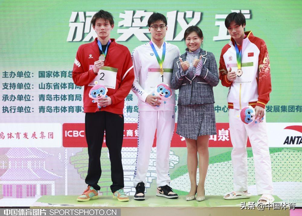 (左起)亞軍趙家悅、冠軍沈加豪、季軍王毅在男子50米自由泳頒獎儀式上