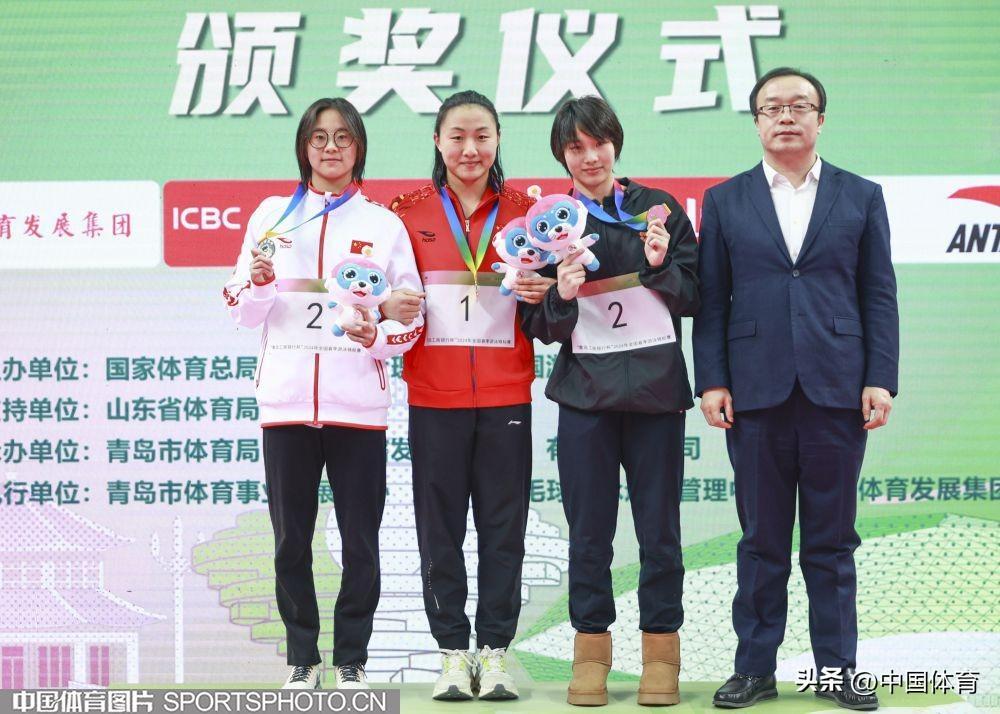 (左起)亞軍章夢妮、冠軍龔真琦、季軍楊王詩雅在女子100米蝶泳頒獎儀式上