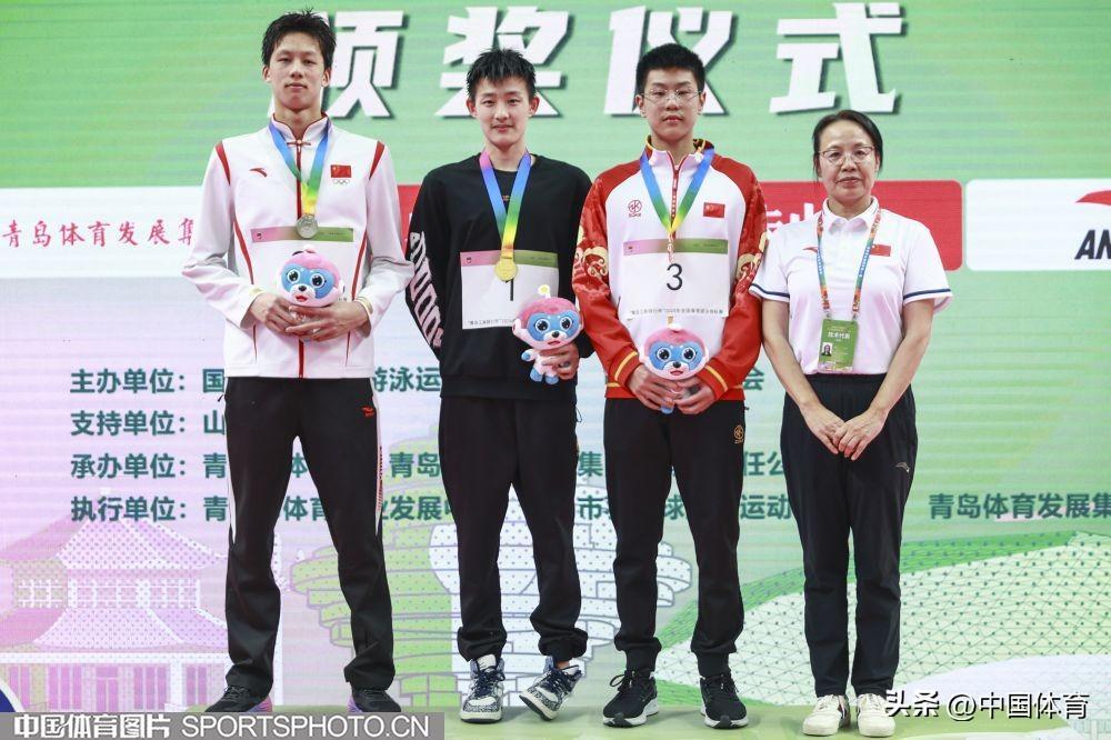 (左起)亞軍胡翔宇、冠軍沈加豪、季軍孫晨博在男子100米自由泳頒獎儀式上