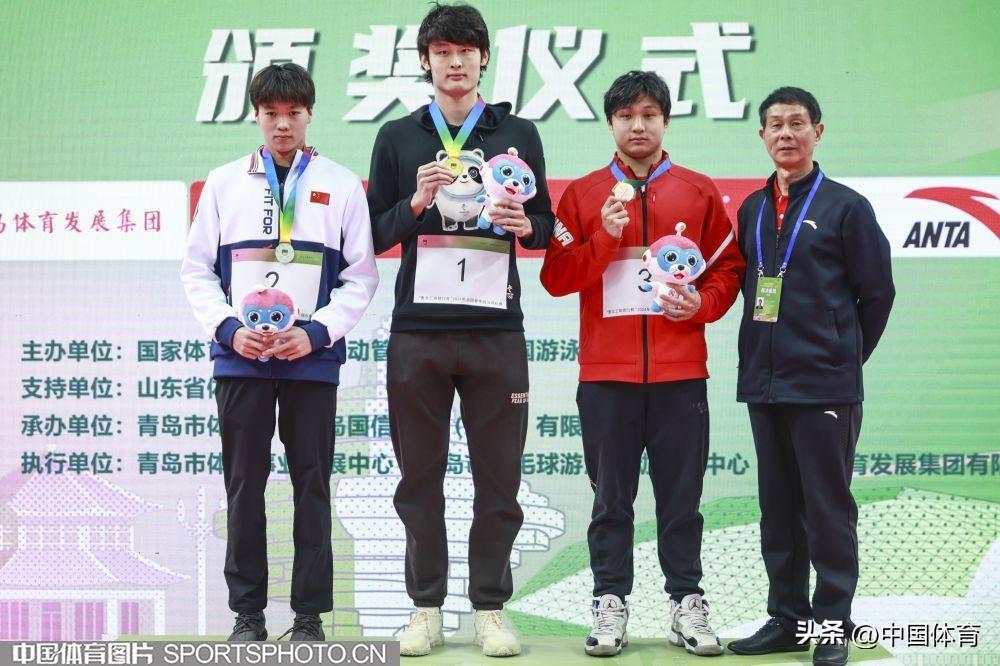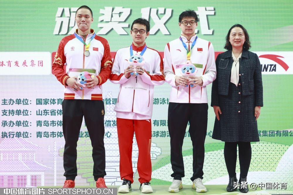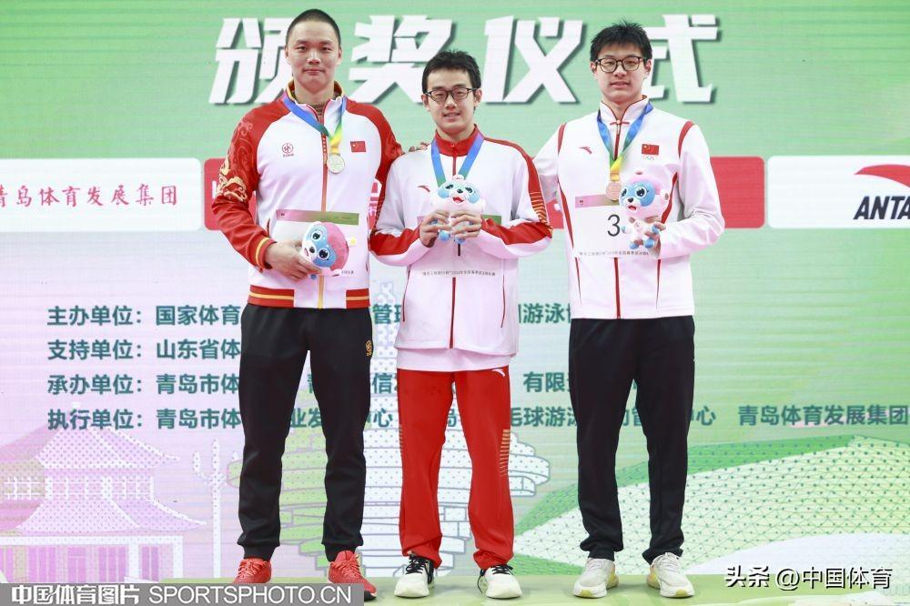 (左起)亞軍吳俊辛、冠軍徐放、季軍朱俐帆在男子100米蝶泳頒獎儀式上