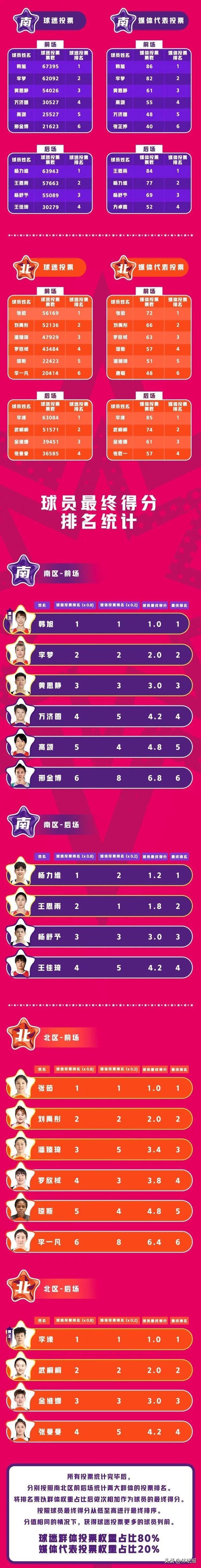 本次全明星賽的投票規則爲:所有投票統計完畢後,分別按照南北區、前後場統計兩大羣體的投票排名,將排名乘以羣體權重佔比(80%球迷羣體投票+20%媒體代表投票)後依次相加作爲球員的最終得分,按照球員最終得分從低至高進行最終排序。分值相同的情況下,獲得球迷投票更多的球員列前。