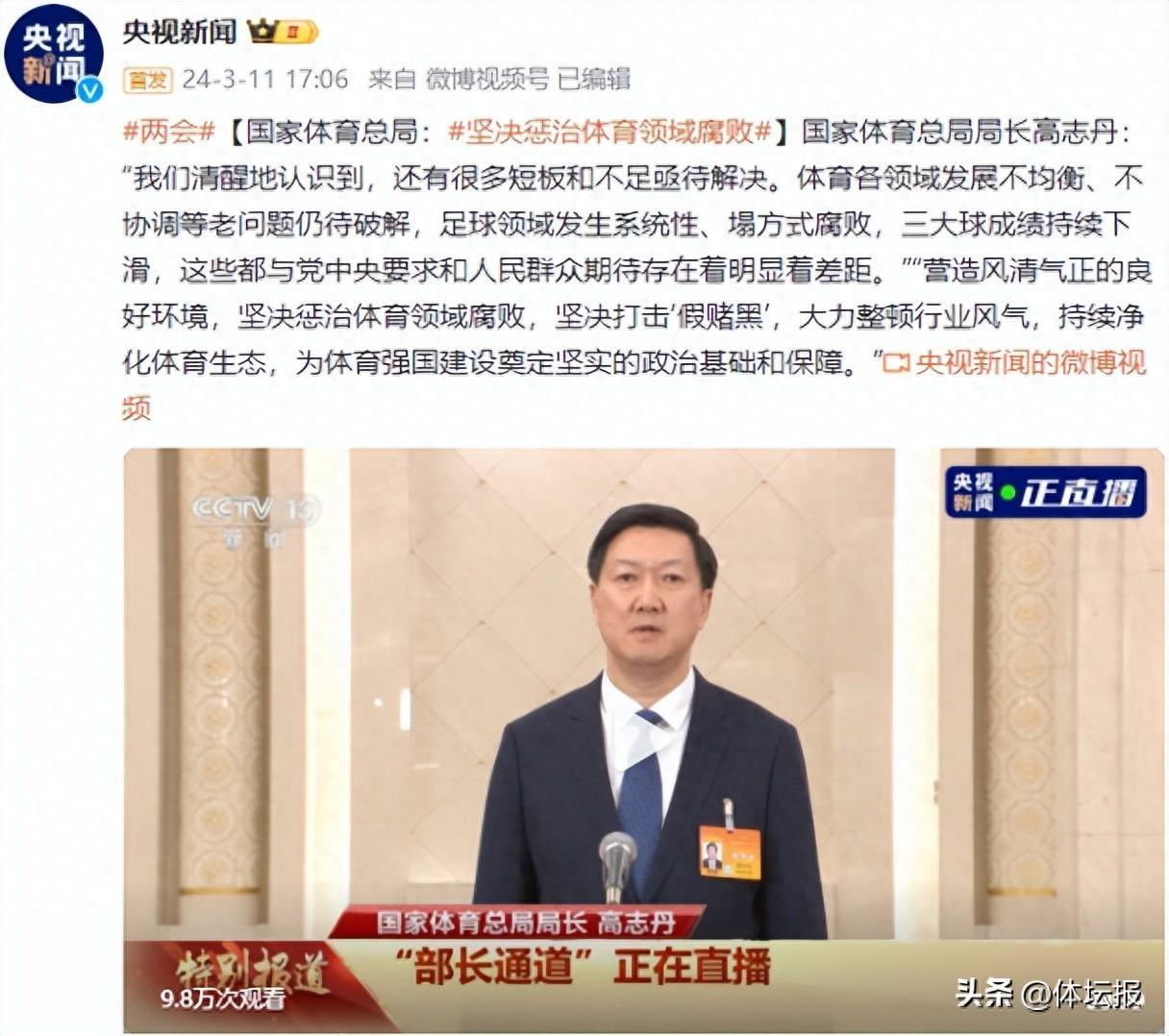兩會聚焦|國家體育總局局長高志丹:堅決懲治體育領域腐敗,堅決打擊“假賭黑”