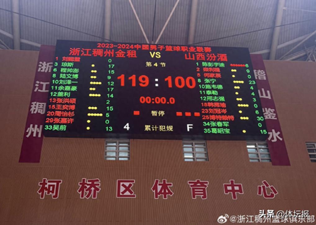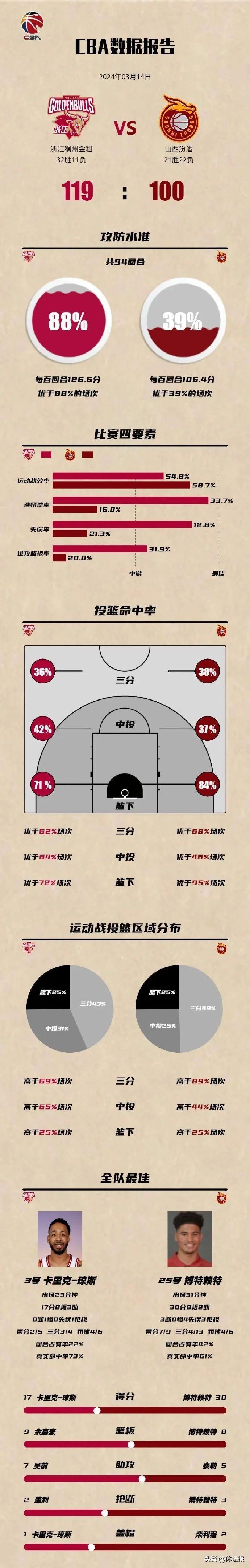 末節決戰,浙江隊穩紮穩打,山西隊的外援博特賴特和張寧雖然個人得分都超過了20,但無奈獨木難支。最終,浙江隊119:100輕取山西隊。