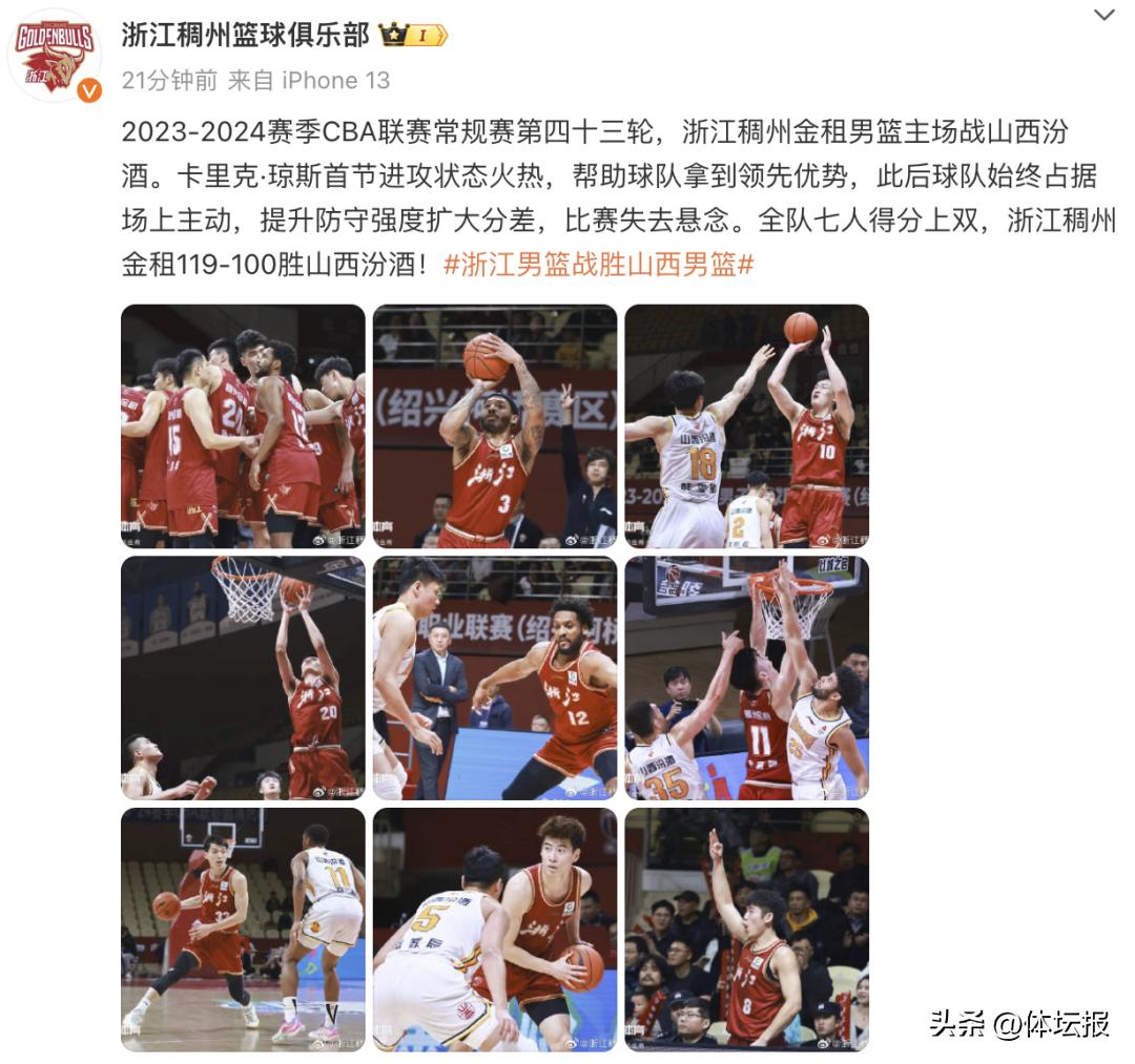 3月14日,CBA常規賽第43輪比賽繼續進行,浙江稠州金租男籃主場以119:100戰勝山西男籃。排名第三的浙江男籃目前距離榜首遼寧男籃還差4個勝場。