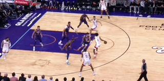 格林在殺入禁區後,偶爾還是會有這種極限甩鍋的操作,這時候就體現出範弗裏特的重要性了,把一個幾乎要出界的失誤變成三分線外的飛餅。