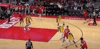 面對濃眉鎮守的湖人籃下,依舊果斷變向殺入,拉桿終結。