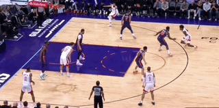 布克一頂就彈開了格林,好在格林果斷拉出來投進三分。在格林拉出三分線後,布克完全沒有補上去的意思,還是優先放投防突。如果格林的遠射更穩定一些,對手就更難防他了。