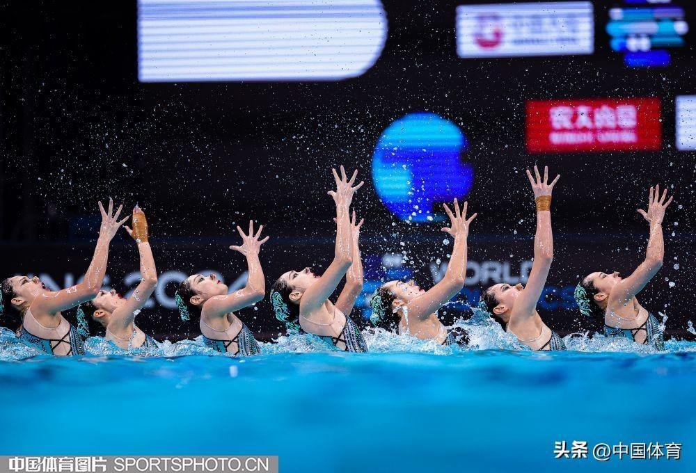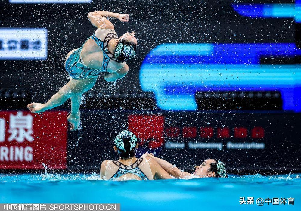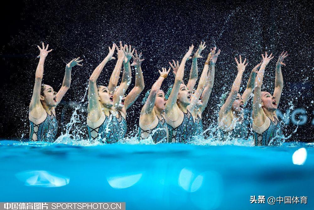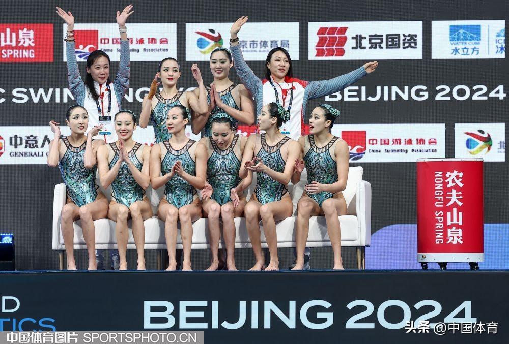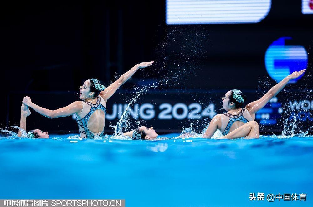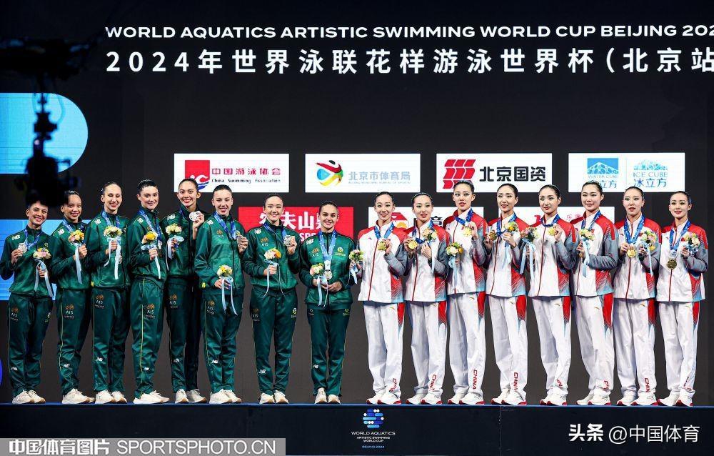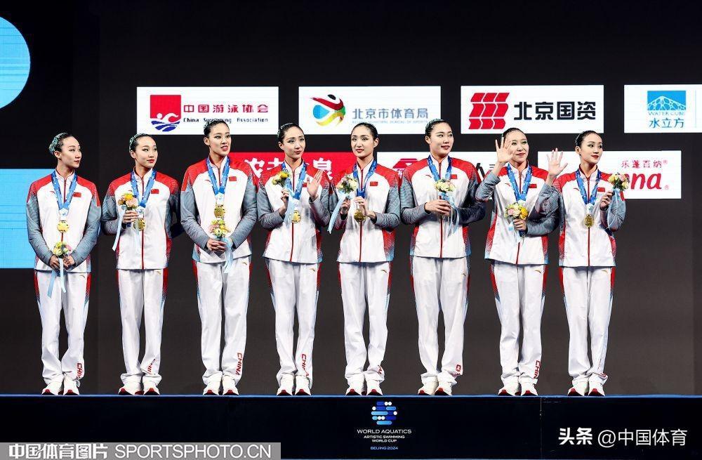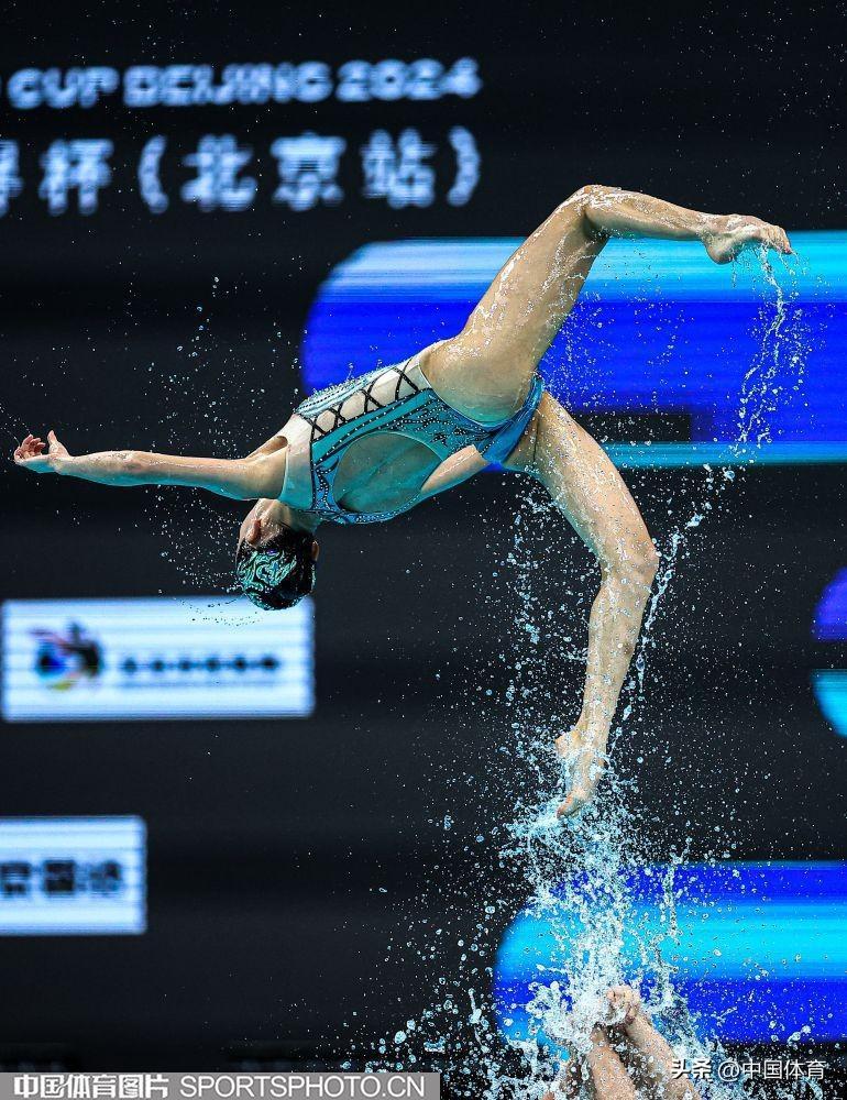中國體育訊 4月6日,世界泳聯花樣游泳世界盃(北京站)在北京國家游泳中心繼續進行。在集體自由自選的比賽中,中國隊以343.3479分奪得冠軍。(中國體育圖片 安靈均 攝)
