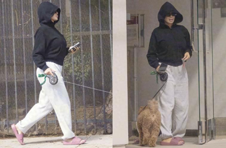 49歲拉爾薩近照,素顏外出遛狗!大媽狀態顯露,好身材包裹嚴實