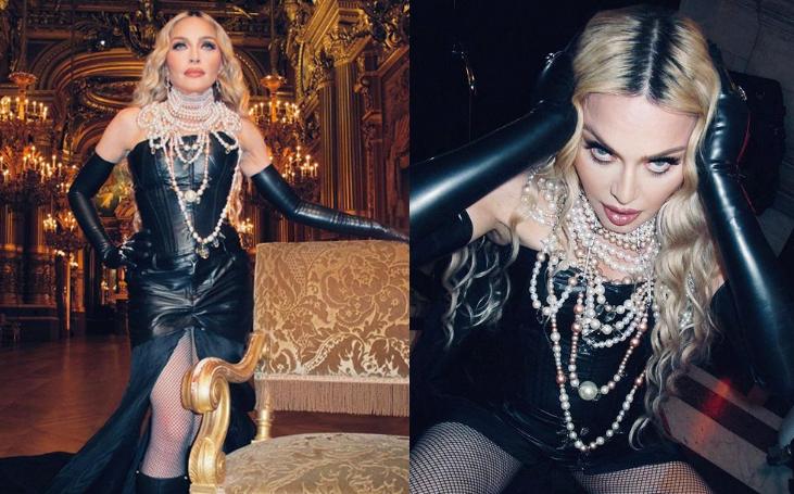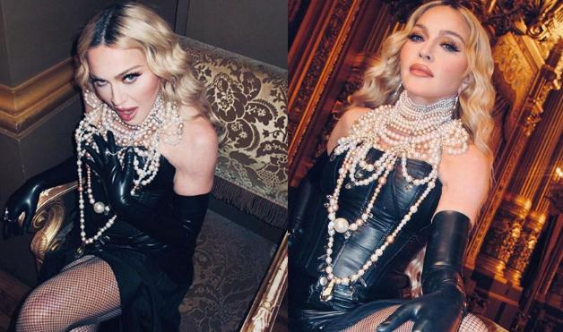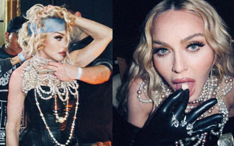 65歲的麥當娜穿着黑色皮質連體裙,下半身裹着網格黑絲,脖子上掛了不少吊墜項鍊,看起來頗爲繁複,但如此浮誇的造型,卻與麥當娜相得益彰,或許只有一代“女帝”能穿出如此風範。