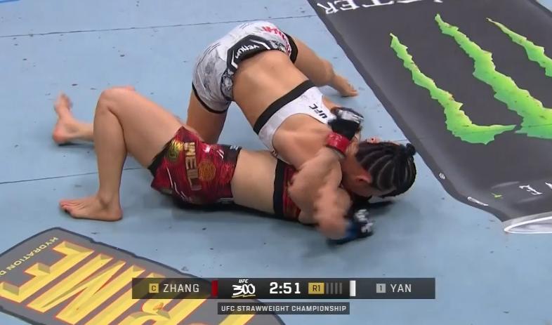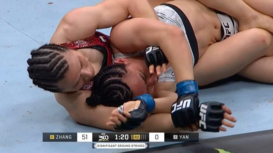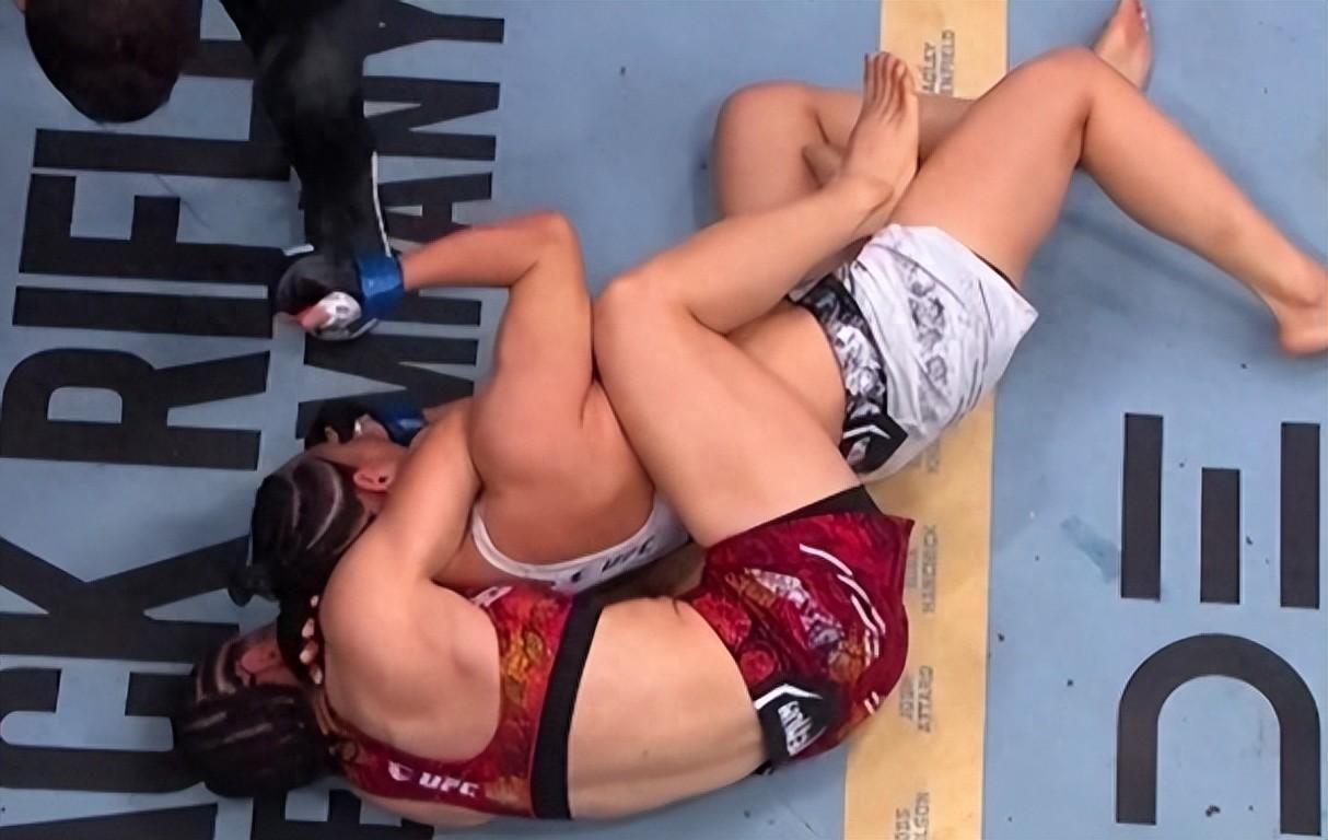 比賽開始,張偉麗閆曉楠碰拳致意,武者間的互相尊重,開始之後,閆曉楠的進攻勢頭更強,TD了張偉麗,拿到上位,曉楠一改往日風格,出其不意的戰術,張偉麗的打法被剋制,閆曉楠抓住漏洞精準打擊,持續拿分。不過第一回合最後,張偉麗實現裸絞,但頑強的閆曉楠硬生生地給扛住了。好驚險,再多一秒,閆曉楠恐怕就被裸絞暈了!