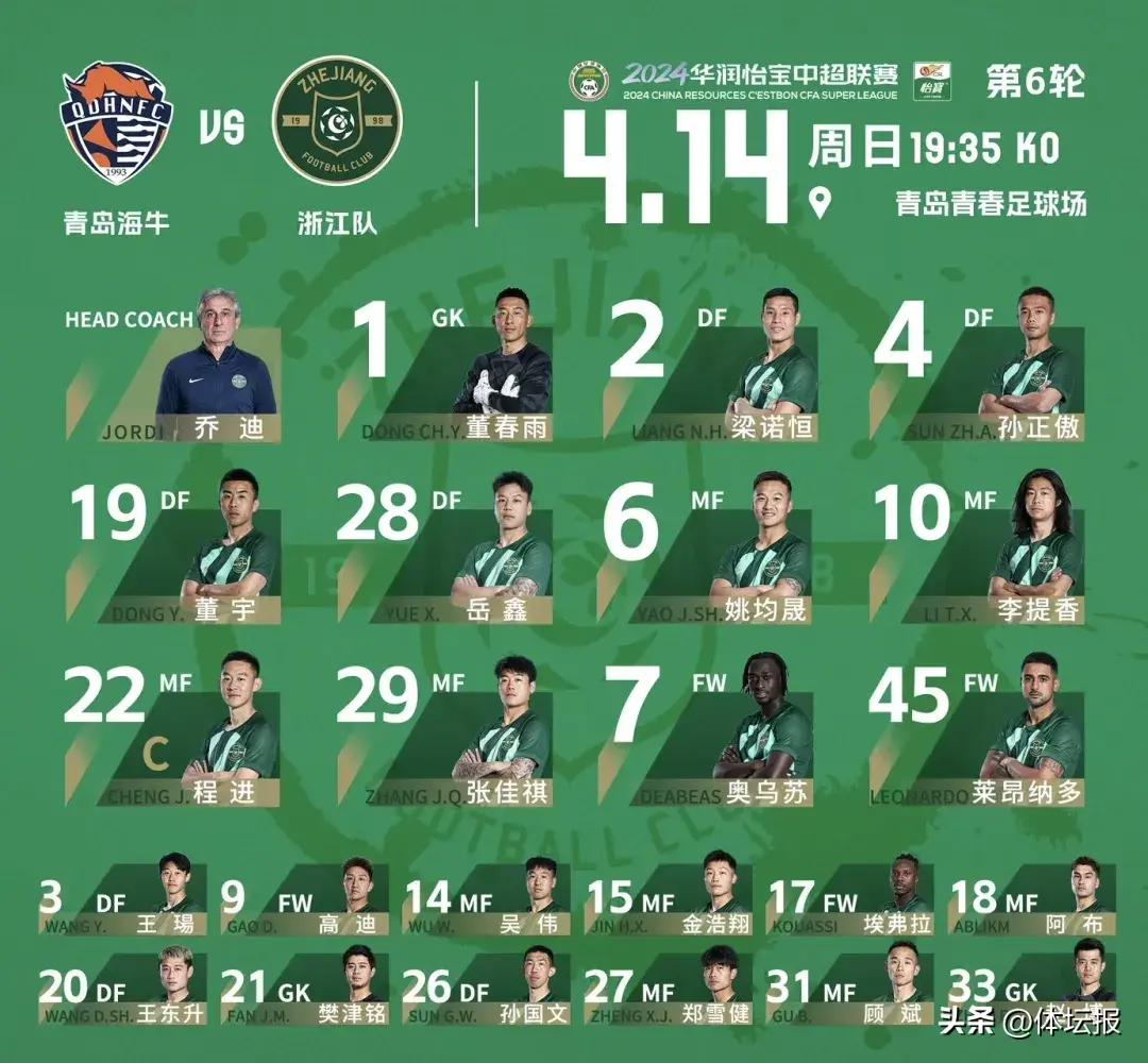 4月14日,浙江隊開啓中超第六輪比賽的爭奪,本場比賽,球隊繼續客場挑戰青島海牛,最終浙江隊以0-2負於對手。