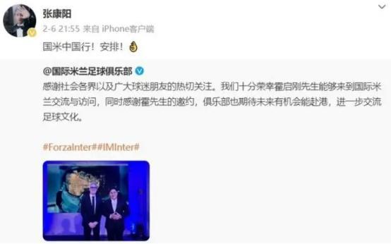 2018年,張康陽接任意大利國際米蘭足球俱樂部主席,成爲該俱樂部歷史上最年輕的主席。在他的領導下,國際米蘭足球俱樂部取得了顯著的業績提升和品牌影響力擴大。他帶領俱樂部獲得了多項榮譽和獎項,爲球隊的發展注入了新的活力。
