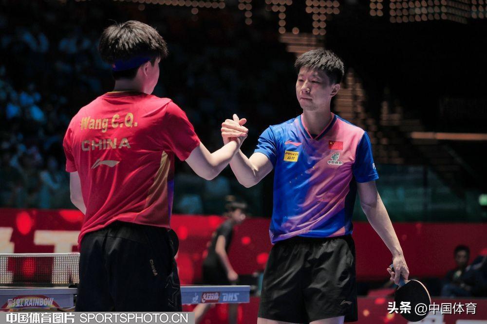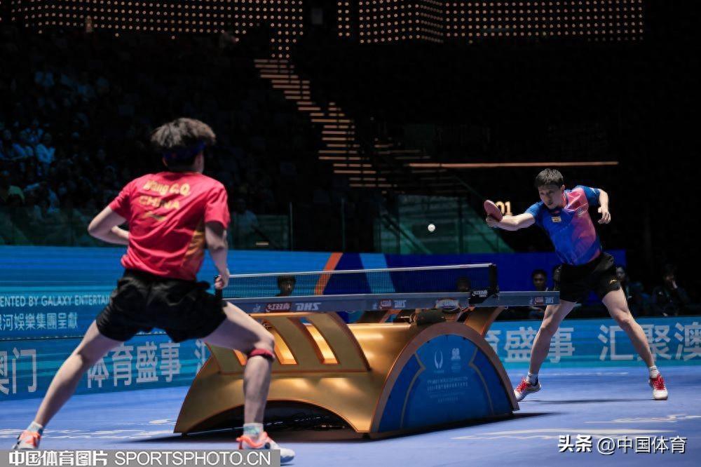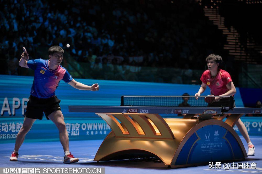 中國體育訊 4月20日,2024年國際乒聯世界盃繼續在澳門銀河綜藝館舉行。在男子單打半決賽中,中國隊選手(藍衣)馬龍以4比0戰勝隊友王楚欽,晉級決賽。圖爲馬龍與王楚欽在比賽中。(中國體育圖片 鹿麟 攝)