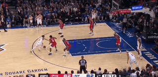 但76人的問題比湖人更純粹,他們純粹是搶不過尼克斯。這一回合哈特和博揚三分輪番打鐵,但第一次,羅賓遜憑藉身高和敏銳的直覺搶下前板,分給博揚出手後,哈特又準確判斷落點,卡位搶下第二個進攻板——在博揚出手的瞬間,尼克斯有三人同時在往籃下趕。