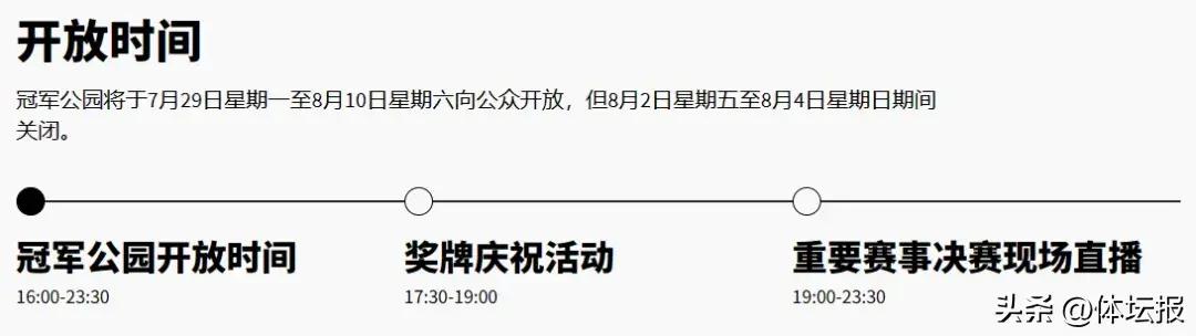 冠軍公園每日開放時間爲16:00-23:00,獎牌慶祝活動時間爲17:30-19:00,重要賽事決賽現場直播時間爲19:00-23:30。