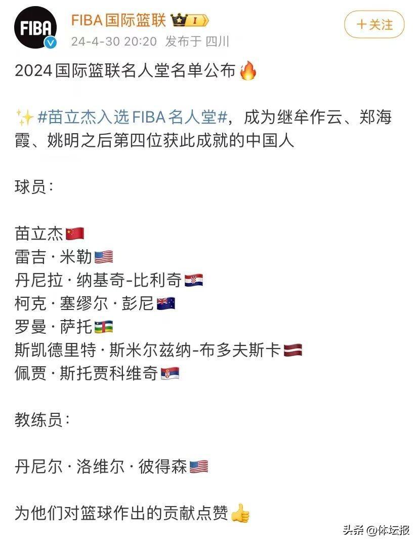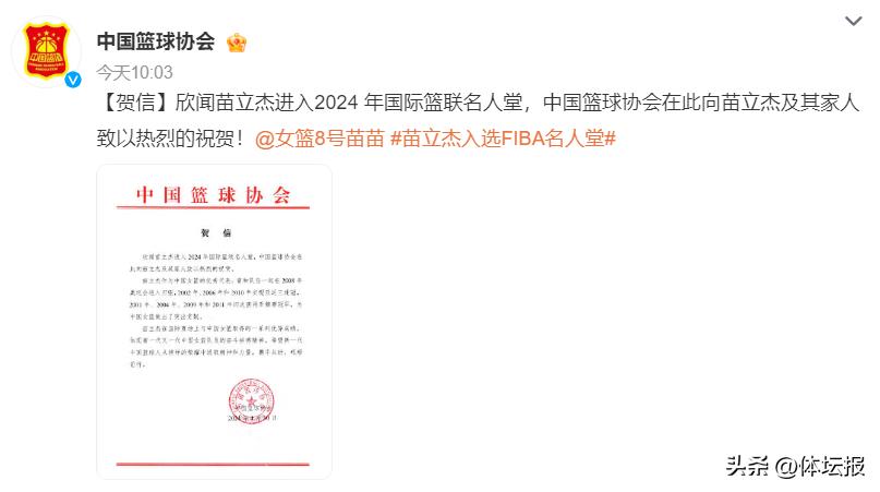 隨後,中國籃球協會發文,祝賀苗立傑入選2024年國際籃聯名人堂。