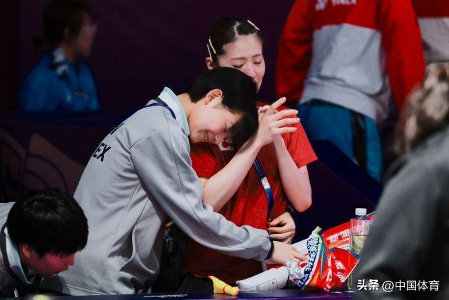 中國體育訊 5月4日,2024年湯尤杯羽毛球賽在成都高新體育中心體育館進入第八個比賽日。在上午進行的尤杯半決賽中,日本女隊以0比3負於東道主中國隊,無緣決賽。其中日本羽壇第一美女志田千陽與隊友松山奈未在先贏一局的情況下,被中國組合陳清晨/賈一凡連追兩局,最終以1比2告負,爲日本隊丟掉了第二分。前兩天剛剛度過27歲生日的志田千陽賽後遺憾落淚。(中國體育圖片 鹿麟 攝)