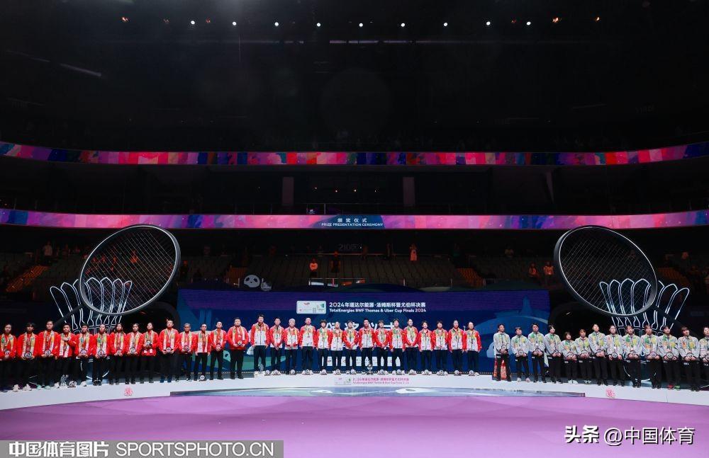 中國體育訊 5月5日,2024年湯尤杯羽毛球賽在成都高新體育中心體育館展開收官日的爭奪。在上午進行的尤伯杯決賽中,中國女隊以3比0橫掃印尼隊,第16次捧起尤伯杯冠軍獎盃。具體戰績爲:陳雨菲2比0( 21比7、21比16)戰勝瑪麗斯卡;陳清晨 /賈一凡2比0( 21比11 、21比8)戰勝拉馬丹蒂/麗比卡;何冰嬌2比1(10比21、21比15、21比17)戰勝埃斯特。(中國體育圖片 鹿麟 攝)