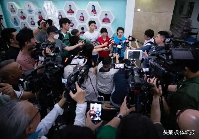 5月7日,中國跳水隊隊員王宗源、全紅嬋和陳芋汐(後排從左至右)在訓練後接受採訪。圖自新華社