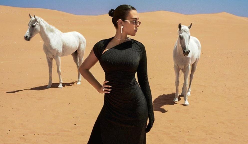 喬治娜拍時尚大片,穿紅袍現身沙漠!美人牽駿馬,氣場不輸C羅