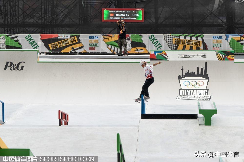 中國體育訊 5月16日,巴黎奧運會資格系列賽在上海黃浦濱江舉行。在男子滑板街式預賽中,中國選手張傑出戰。(中國體育圖片 李翔 攝)