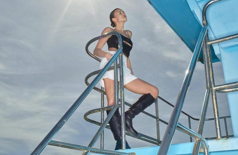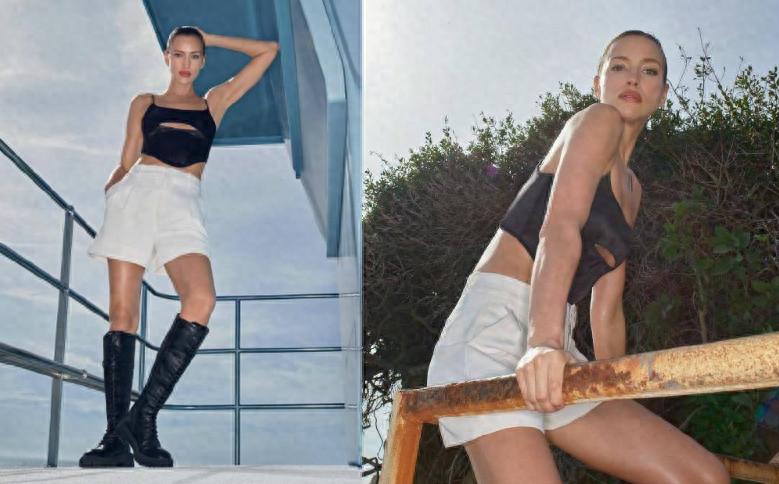 此番來到海灘拍攝時尚大片,伊蓮娜的一條黑色鏤空吊帶裹身,白色短褲秀出完美長腿,幹練清爽的丸子頭,頗有點少女氣息,雖然已經快奔四的年齡了,但伊蓮娜在鏡頭前的時尚張力還是很強的,站在燈塔之上,擺出很多造型,氣場強大,魅力十足。
