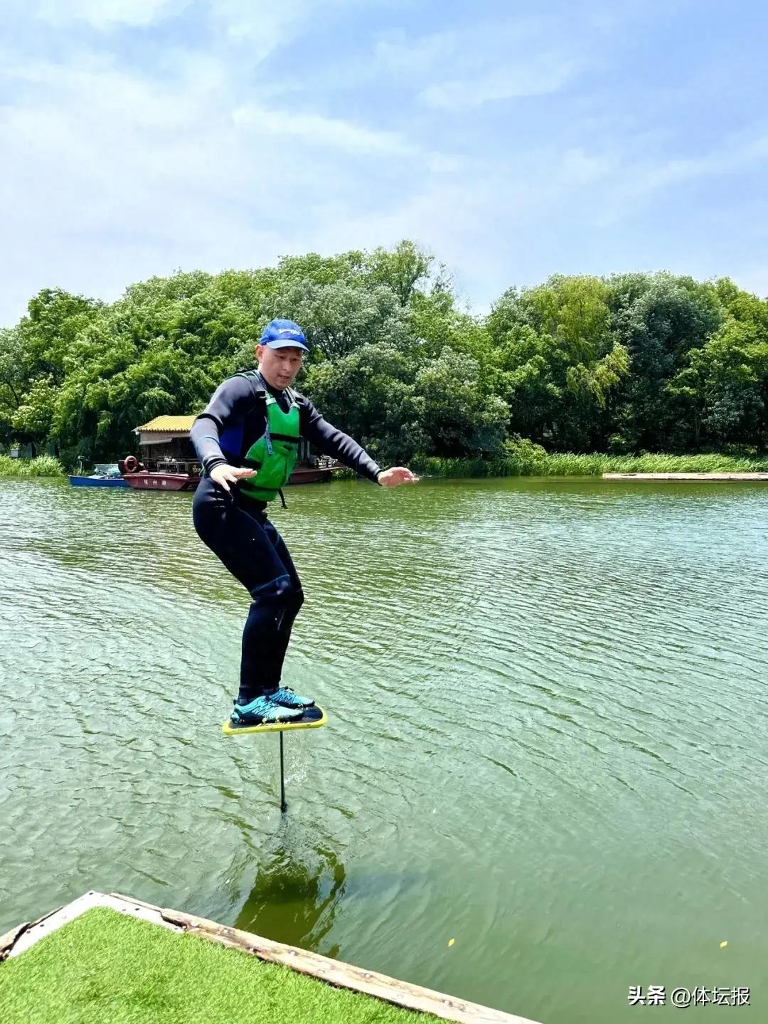 來自寧波的邱軍文是馬拉松和水上運動愛好者,平時通過視頻向徐建敏遠程請教,總覺得效果不顯著,當天特意從寧波趕來請師傅現場指導。在數次“炸水”後,終於在水面上滑行了10米左右的距離,這讓他興奮不已。“前期無數次的落水,會讓人很有挫敗感,但就像跑馬拉松一樣會有一個最難的時刻,只能靠意志不斷堅持纔會有一點突破。”