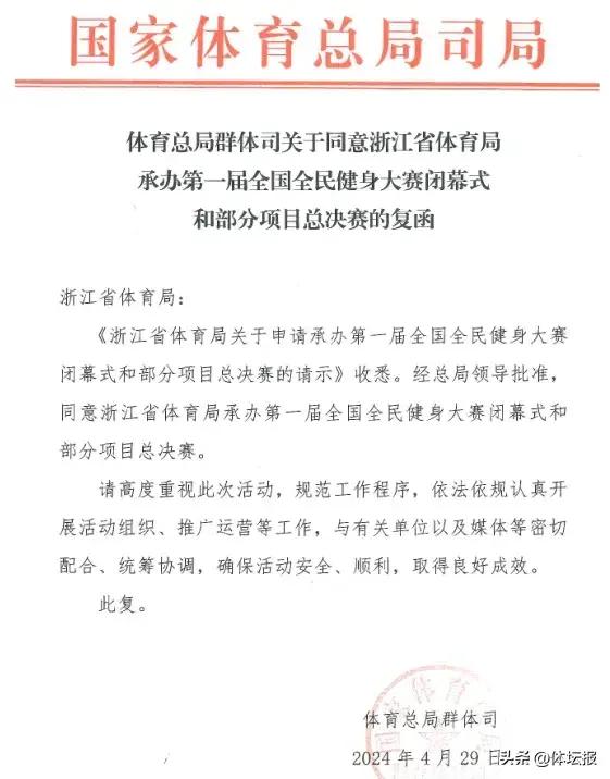 記者瞭解到,浙江省體育局還將承辦第一屆全國全民健身大賽閉幕式和部分項目總決賽。