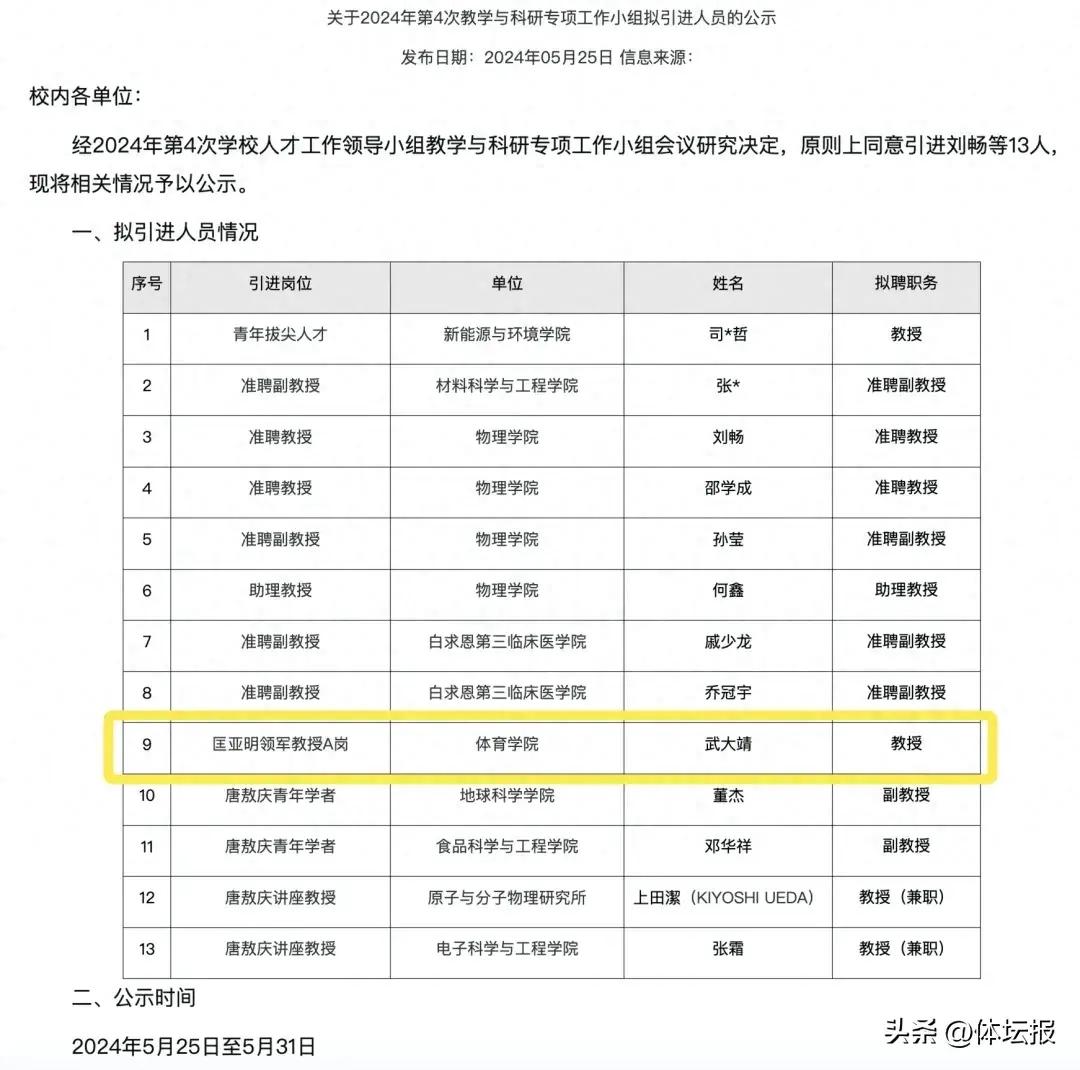 5月25日,吉林大學人才工作辦公室發佈了2024年第4次教學與科研專項工作小組擬引進人員公示。其中,武大靖擬聘爲吉林大學體育學院教授,定爲匡亞明領軍教授A崗(匡亞明是吉林大學老校長,對吉大有開創之功)。