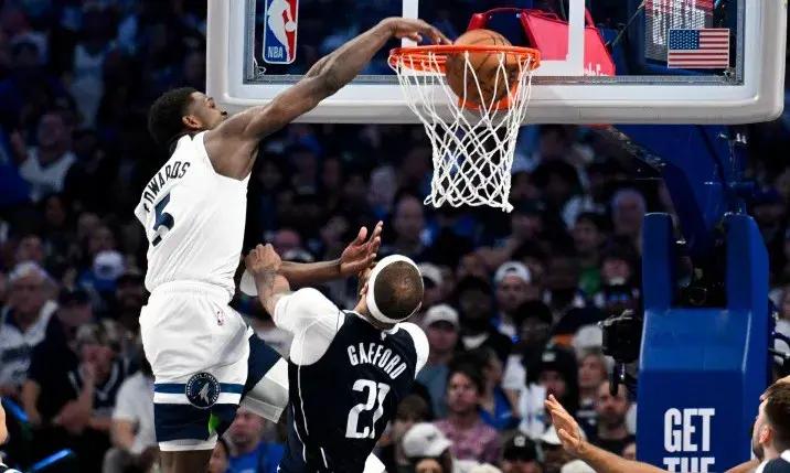 而森林狼則不然,他們在大多數回合中選擇相信麥克丹尼爾斯和愛德華茲的單防和擠掩護能力,讓戈貝爾對位對方的五號位守沉退,然後就坐在那裏眼巴巴的看着東契奇和歐文在中距離摧毀他們而無動於衷——首先是一次擋拆,然後森林狼的對位防守球員會落後一個到半個身位,然後東契奇會走到中近距離打窩,如果戈貝爾不上鉤,他就會用一個簡單的中投或者拋射拿下兩分,如果戈貝爾上鉤,就會演變成一次空中接力或者前場籃板。如果森林狼再加上側翼的協防,那最終就會演變成一個底角的空位三分球。最後的結果是既沒有摁住東歐,也沒有防住射手,只能跟着獨行俠的節奏走。