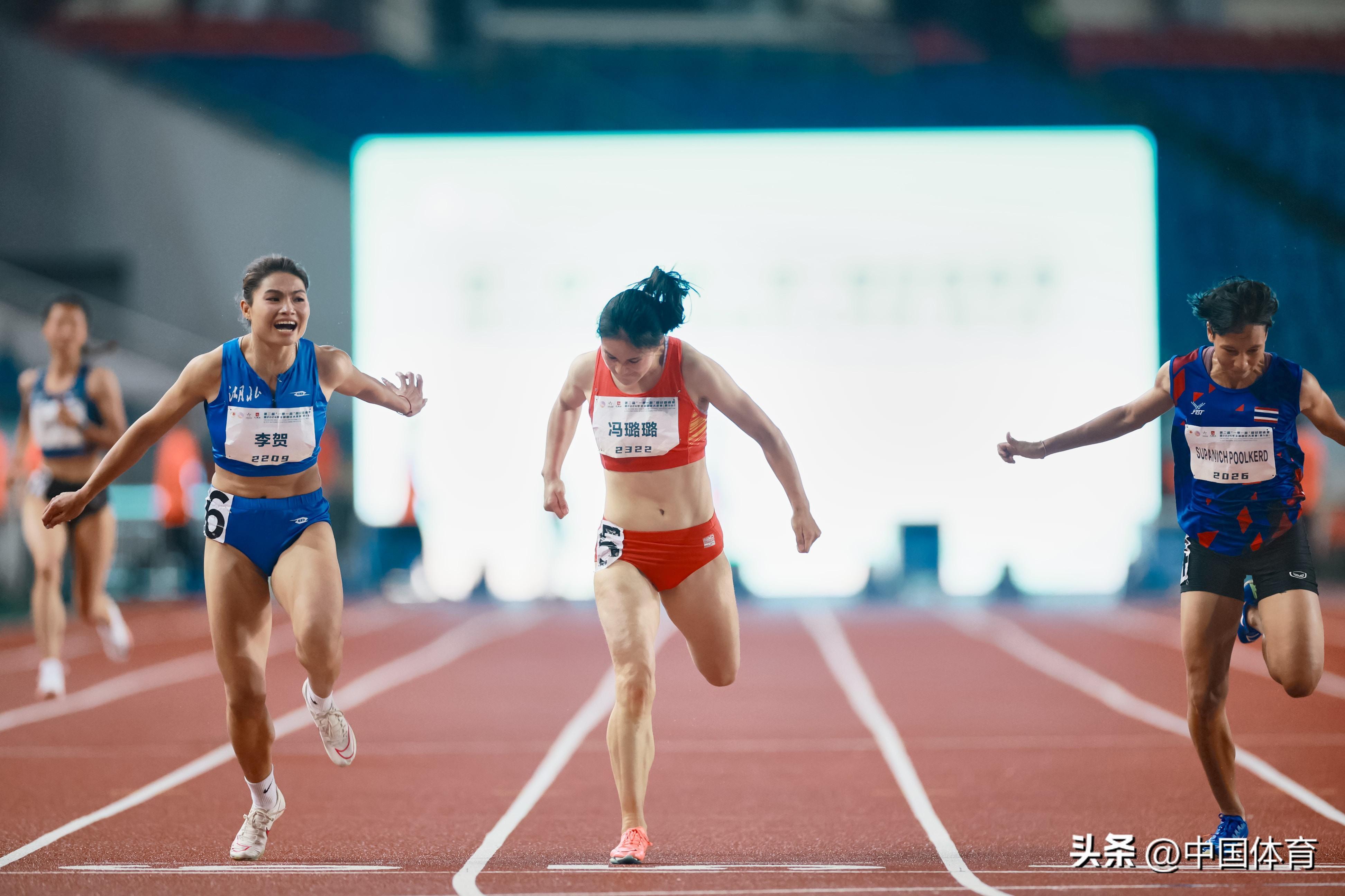 女子100米決賽中,湖北彈射者隊李賀以11秒55摘金,陝西隊馮璐璐以11秒57奪銀,泰國選手獲得銅牌。